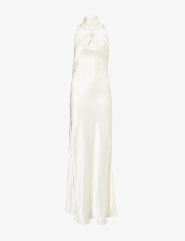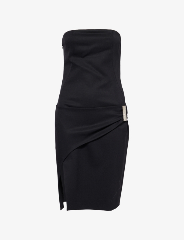 - Relaxed fit, round-neck, dropped shoulders, wide long sleeves, engraved plaque at front, ruched