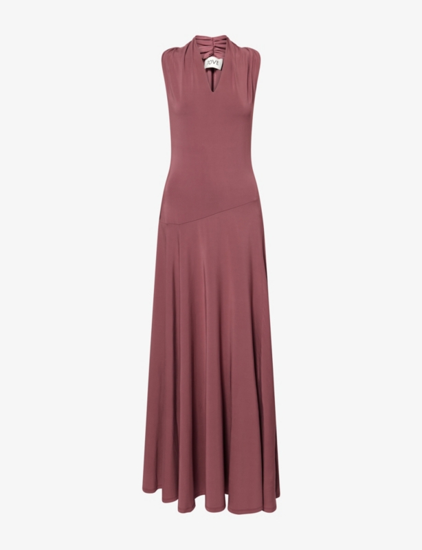 - Regular fit, draped cowl neck, sleeveless, side slit, column silhouette, maxi length
